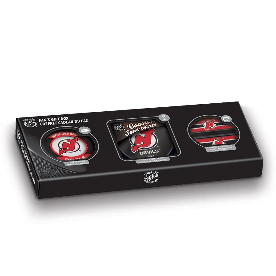 This NHL New Jersey Devils Fan’s Gift Box is the perfect gift for any hockey enthusiast. Included in this box is a Souvenir Puck, a set of 4 Puck Coasters and a Media Device Puck Holder.